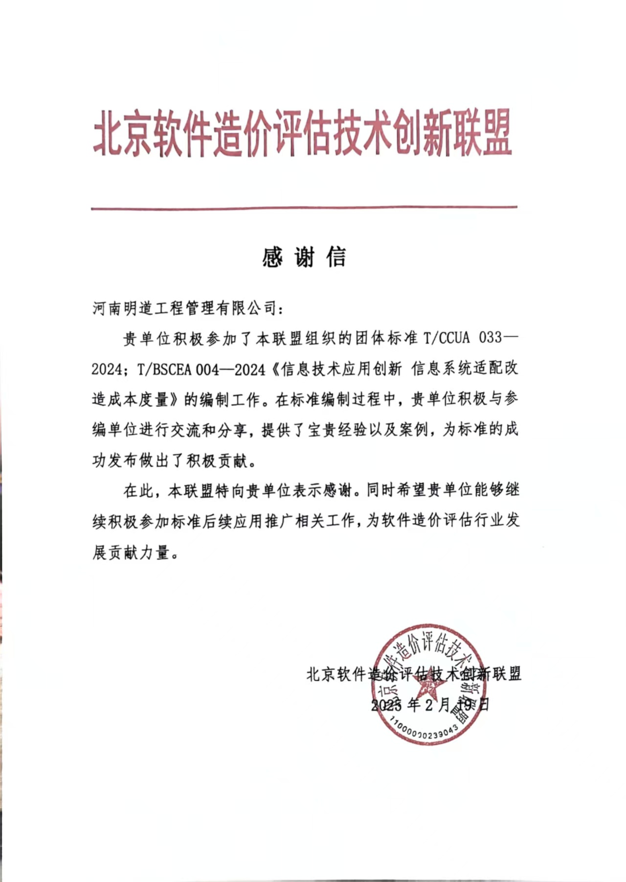 2025年2月19日,河南明道工程管理有限公司收到北京軟件造價(jià)評(píng)估技術(shù)創(chuàng)新聯(lián)盟發(fā)來的感謝信,聯(lián)盟對(duì)于明道在《信息技術(shù)應(yīng)用創(chuàng)新 信息系統(tǒng)適配改造成本度量》(T/CCUA 033-2024)的編制工作中做出的積極貢獻(xiàn)表示了充分的肯定和由衷的感謝。