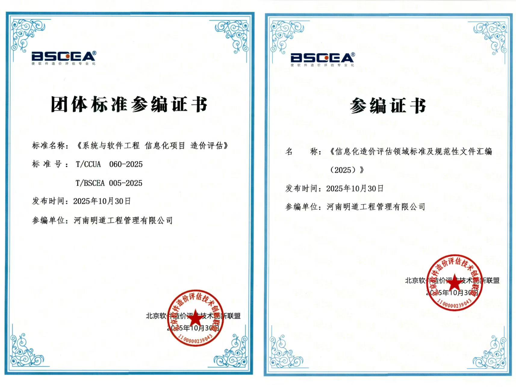 明道公司4名軟件工程造價師楊森、宋方舉、呂文龍、王俊鋒參與了上述標(biāo)準(zhǔn)研制、政策與案例匯編等工作,公司在信息化造價評估方面的積累與貢獻(xiàn),不僅提升了公司的核心競爭力,更以實際行動推動了行業(yè)的規(guī)范化、專業(yè)化進(jìn)程,譜寫了守正創(chuàng)新、多措并舉的發(fā)展新篇章。